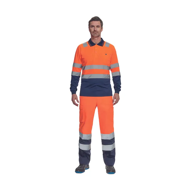 Men’s HI-VIS poloshirt with long sleeves » reflective stripes across shoulders and around hips » 3 buttons placket » 1 chest pocket » elastic sleeve hem.