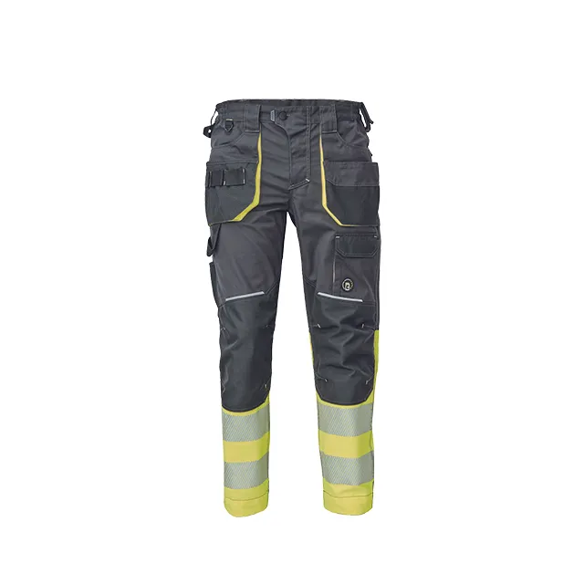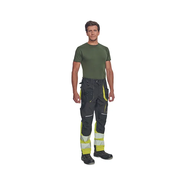 Men’s workwear HI-VIS pants with elastic waist and multifunctional pockets • Oxford 600D reinforcement of knee pockets for knee pads insertion • durable triple stitching of legs and crotch • reflective piping, bottom leg with 7 cm reflective printed and segmented stripes • extendable legs length